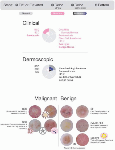 ![]() FIGURE 7.2 Clinically elevated lesions that are pink or skin-colored, with a multicolored (brown + other = gray, pink, and/or yellow) dermoscopic pattern. |