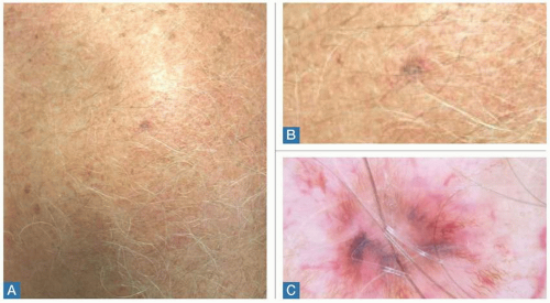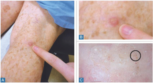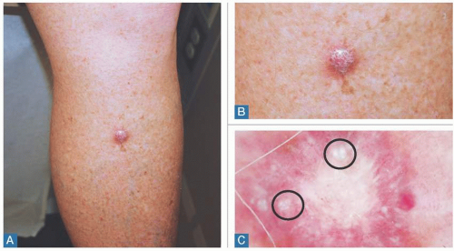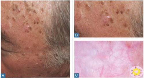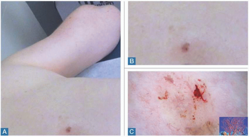 Figure 7.15 shows a clinically elevated, pink/skin-colored lesion (Figure 7.15A, B) with a multicolored (brown + pink) dermoscopic pattern (Figure 7.15C). Here, you see the entire
