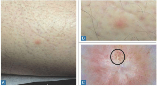 Figure 7.9 shows a clinically elevated, palpable, pink/skin-colored lesion (Figure 7.9A, B) with a multicolored (brown + pink) dermoscopic pattern (Figure 7.9C). You can see the central crystalline scar-like pattern with a faint pseudonetwork pattern at the periphery. Additionally, there are little rosettes circled in black that can often be seen in more elevated or thicker lesions. Diagnosis: Dermatofibroma.