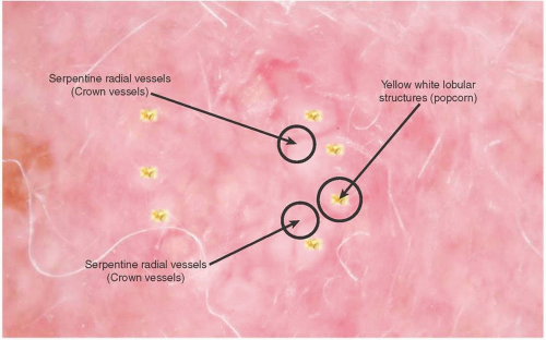 ![]() FIGURE 7.13 Sebaceous hyperplasia. Clinically elevated lesions that are pink or skin-colored, with a multicolored (brown + other = gray, pink, and/or yellow) dermoscopic pattern. Here, you can see the dermoscopic pattern of Figure 7.11, with yellow-white lobular structures that resemble popcorn and serpentine radial vessels that resemble a crown; they usually do not cross the midline. |