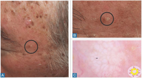 ![]() FIGURE 7.15 Clinically elevated lesions that are pink or skin-colored, with a multicolored (brown + other = gray, pink, and/or yellow) dermoscopic pattern. Review these clinical and dermoscopic examples of a sebaceous hyperplasia. A,B: Clinical example. C: The dermoscopic example shows yellow-white lobular structures that resemble popcorn and serpentine radial vessels that resemble a crown; they usually do not cross the midline. Note the central dell visible in this lesion.
