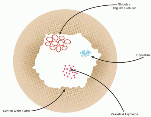 Step 4 Patterns: See Figure 7.7. Remember your patterns from Chapter 1: faint pseudonet-work-like periphery, pigmented network, central white patch, central vessels and erythema, globule-like/ring-like globules, and crystalline structures.