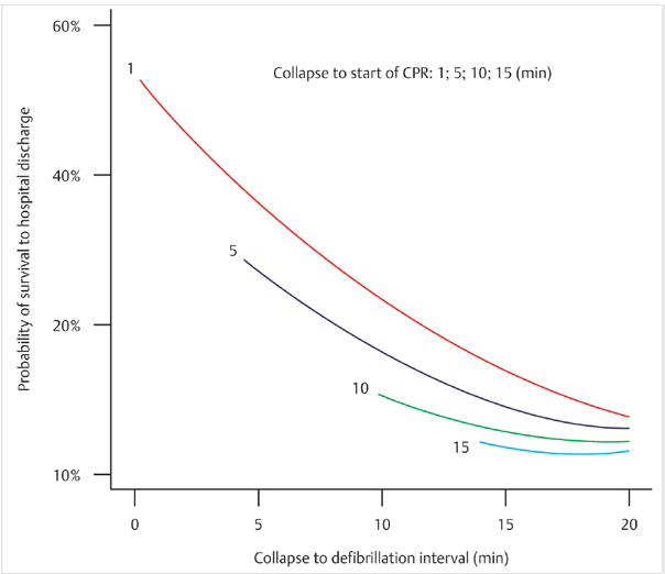 Fig. 33.1 Effect of collapse-to-cardiopulmonary resuscitation (CPR) interval and collapse-to-defibrillation interval on survival to hospital discharge.