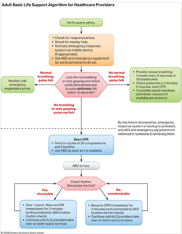 The AHA BLS Healthcare Provider Adult Cardiac Arrest Algorithm—2020 update is shown in Fig. 33.2.