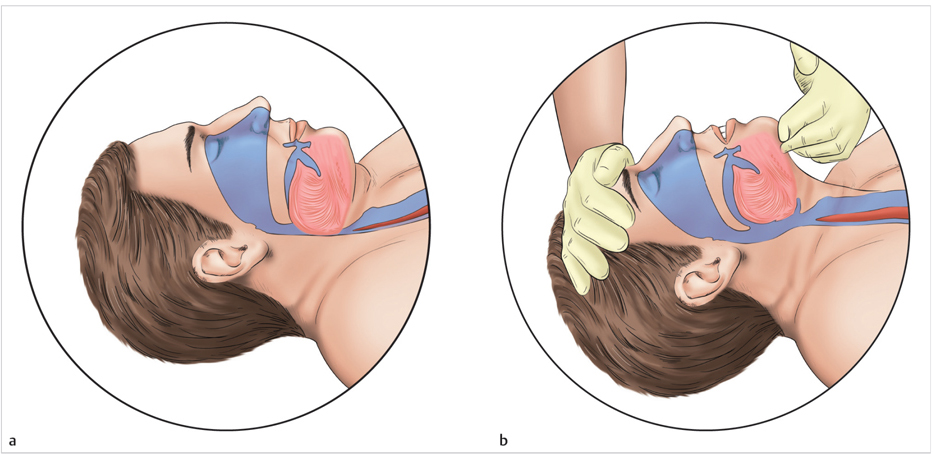 Fig. 33.3 Opening the airway. (a) Airway obstruction produced by tongue and epiglottis. (b) Relief by head tilt and chin lift.
