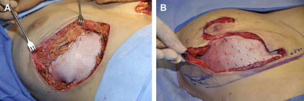 To provide fixation of the mesh at the boundaries of the breast mound, adequate undermining is required. Vigilance in attention to flap thickness is necessary because of the wider undermining. Fixation to chest wall is necessary unless the mesh is used only for shaping, but generally, setting the inframammary, medial, and lateral folds is helpful and necessary if a sling effect is desired. If possible, a cuff of the graft a few millimeters wide is splayed onto the chest wall and sutured with #00 polydioxanone or similar resorbable material. The anterior or superior edge may be sutured directly to the parenchyma or deepithelialized dermis. Sitting the patient upright to asses shape is critical before final tailoring and adjustments. Matching the internal bra to the skin envelope in the upright position avoids irregularities from redundancy and overresection leading to tension on the closure.