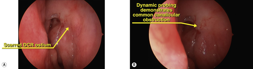 Probing should confirm the presence of a canalicular obstruction. Dynamic probing with intranasal endoscopic visualization aids in the diagnosis. Prognosis for success is typically less for common canalicular stenosis compared to failed DCR with a sac remnant. Combined balloon dacryoplasty and antimetabolite therapy will likely increase the chances of success.
