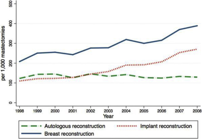 Breast cancer is the most common malignancy in women worldwide according to the World Health Organization, contributing more than 25% to new cancer diagnoses in 2012 (excluding nonmelanoma skin cancer). In the United States, there has been a gradual increase in immediate and delayed reconstruction over the past few decades ( Fig. 1 ). In 2017, there were 106,000 breast reconstructions in the United States, which represents a 35% increase from 2000.