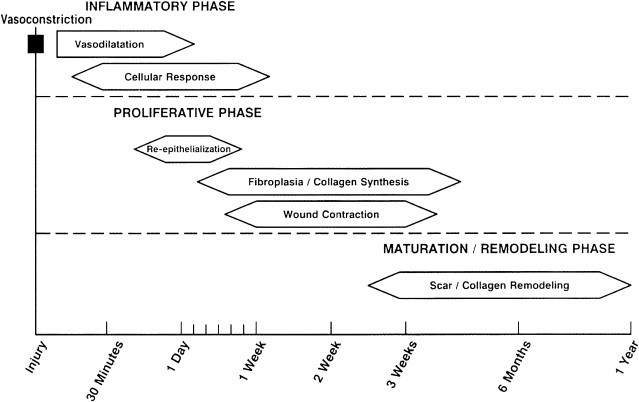 Understanding the physiology of wound healing is important when considering any skin resurfacing procedure. Wound healing occurs in progressive phases: the inflammatory phase, the proliferative phase, and the maturation phase; with significant overlap between the inflammatory and proliferative phases ( Fig. 1 ).