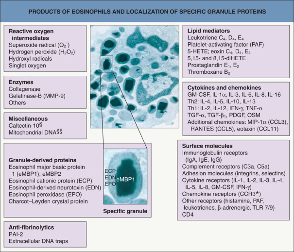 The eosinophil is produced in the bone marrow and circulates transiently (8–18 hours) in the peripheral blood. Except for the bone marrow, gastrointestinal tract (distal to the esophagus), and lymphoid tissues (including spleen, thymus and lymph nodes), eosinophils found within tissues are classically associated with allergic inflammation or extra-gastrointestinal parasitic disease. In 1879, Paul Ehrlich named the “eosinophil” because of the intense staining of its distinctive cytoplasmic granules with the acidic dye, eosin. Ultrastructurally, membrane-bound, specific eosinophil granules have an electron-dense core and less dense matrix ( Fig. 25.1 ). The eosinophil produces multiple factors (e.g. toxic cationic proteins, oxidative products) that contribute to its role in inflammation . Surface molecule expression is important in activation and/or priming and further directs eosinophil involvement in inflammation (see Fig. 25.1 ) .