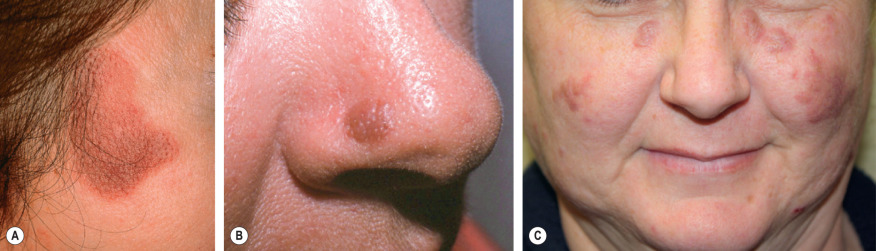 In most patients, a solitary or few red–brown, firm plaques or nodules appear on the face; involvement of extrafacial sites is uncommon