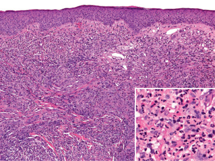 In the dermis, there are perivascular and interstitial infiltrates of neutrophils, lymphocytes and plasma cells, admixed with numerous eosinophils. Characteristically, the inflammation spares the upper papillary dermis, creating a “grenz zone” ( Fig. 25.4 ). Features of leukocytoclastic vasculitis are most prominent early on, with older lesions tending to have fewer neutrophils and more eosinophils and plasma cells as well as fibrosis. Because of the presence of eosinophils, IgG4-bearing plasma cells and lamellar fibrosis, it has been proposed that at least a proportion of cases of granuloma faciale may represent a cutaneous manifestation of IgG4-RD (see Table 25.2 ) .