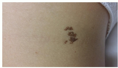 ![]() FIGURE 12.3.1 Keratinocytic epidermal nevus. These lesions may be flat initially, but they tend to become more elevated, verrucous, and darker over time. |