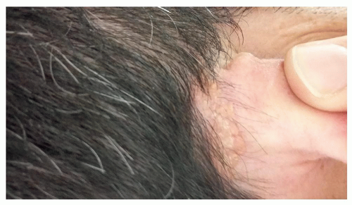 NS is always present at birth; however, it may not be noticed until later in childhood or until after puberty, when hormonal influences to sebaceous glands trigger thickening and the development of a papillomatous surface. Most NS are salmon to yellow colored and have a characteristic smooth waxy surface, which can be complicated by eczematous reactions (Figure 12.3.2).12 Most are located on the scalp or face, although they can be more widespread.5 If they are located on the scalp they are accompanied by alopecia. The size may vary from less than a centimeter to several centimeters in length, and a patient can rarely have multiple lesions.8 There are a few reports of unusually large and exophytic lesions, with histopathological picture consistent with nevus sebaceus.13,14