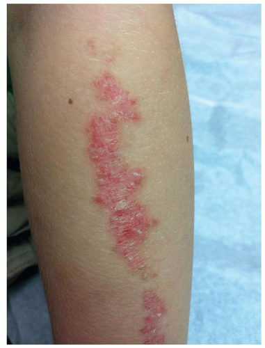 It usually presents in infancy or early childhood on the lower body as an intensely pruritic, unilateral array of linear erythematous and hyperkeratotic papules that often coalesce into plaques (Figure 12.3.4).4,7 The lesion is characterized by intense pruritus and the prognosis is variable, often waxing and waning over time.8 ILVEN is often mimicking psoriasis; however, it is resistant to standard psoriasis treatments and may be difficult to distinguish from linear (nevoid) psoriasis.5