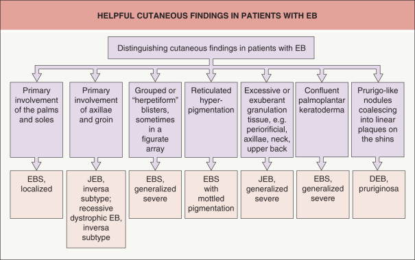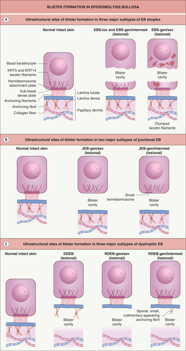 EB is caused by mutations within genes that encode structural proteins that reside within the epidermis (EB simplex), dermal–epidermal junction (junctional EB), or uppermost papillary dermis (dystrophic EB). The site within which each of these proteins resides determines the ultrastructural location where the blisters arise ( Table 32.1 & Fig. 32.1 ).