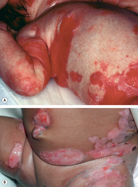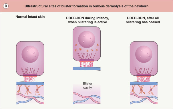In a rare form of DEB referred to as bullous dermolysis of the newborn, inheritance is usually dominant and blistering is typically confined to the first 1–2 years of life . Clinical expression coincides with a time during which type VII collagen is present primarily within basilar keratinocytes in these patients’ skin, rather than along the dermal–epidermal junction (see Fig. 32.1D ). This suggests that there may be a temporary disruption in the transport of this protein from the keratinocyte cytoplasm to the underlying ECM.