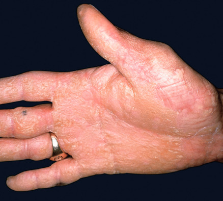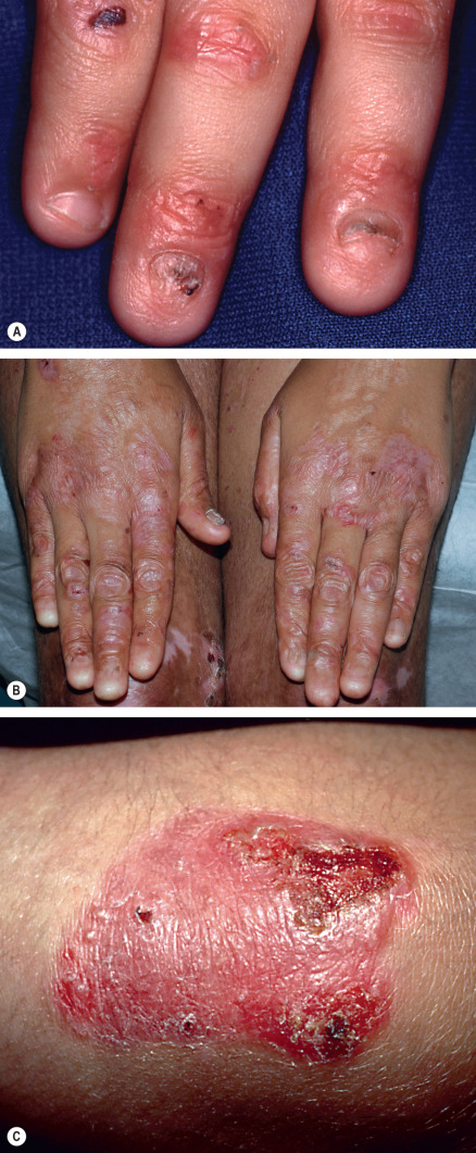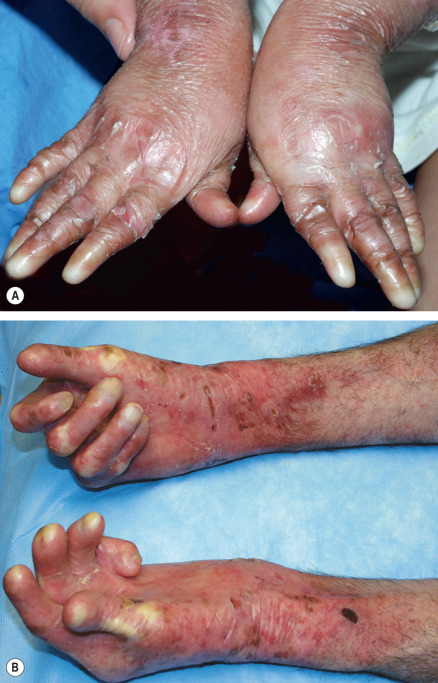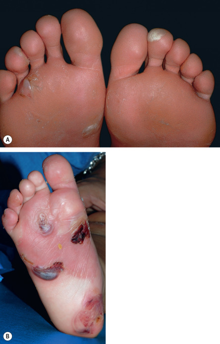 Pseudosyndactyly (“mitten” deformities) of the hands and feet primarily affects patients with RDEB, especially RDEB-gen/sev , although it occasionally occurs to a lesser degree in DDEB and JEB ( Fig. 32.12 ). Initially presenting as proximal web formation between adjacent digits, the digits may eventually become totally fused and encased by scar tissue. Lack of mobility leads to bone resorption and muscular atrophy, and hand function is severely compromised.