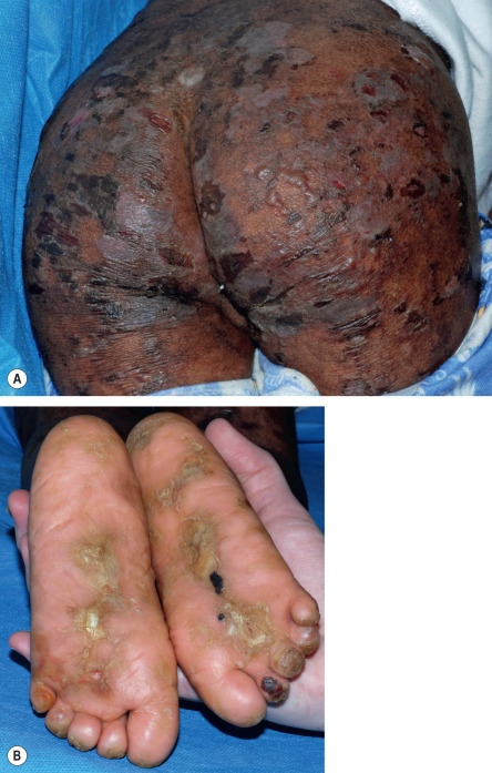 Distribution of skin disease activity is also useful in the subclassification of EB , although the pattern of involvement tends to be less distinctive in infants than in adults. Patients with the “ inversa ” subtypes of JEB and RDEB experience severe disease activity primarily in intertriginous areas such as the axillae and inguinal creases. In contrast, patients with localized JEB have involvement mainly in acral sites, and those with pretibial DEB have lesions almost exclusively on the shins. RDEB centripetalis is a rare subtype that initially features acral blistering, followed by slow progression of disease activity toward the trunk over the years.