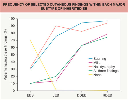 All forms of inherited EB are characterized by mechanically fragile skin, erosions, and (with rare exceptions) macroscopic blisters ( Figs 32.2 & 32.3 ). Scarring is almost always atrophic and can occur in any subtype of EB ( Fig. 32.4 ), including localized EBS. However, scarring is most frequent in the subtypes that are characterized clinically by generalized disease activity and ultrastructurally by disruption of the basement membrane, particularly the lamina densa ( Fig. 32.5 ). Whereas scarring is estimated to occur in only 15% of patients with localized EBS, it is present in essentially every patient with RDEB . Other cutaneous findings that have similar variations in frequency across the major types and subtypes of EB include dystrophic or absent nails (see Fig. 32.4 ), milia, and scarring alopecia of the scalp.