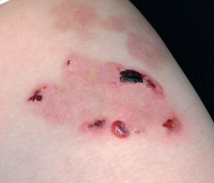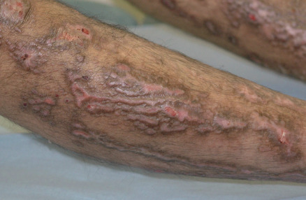 Some cutaneous findings have diagnostic implications ( Fig. 32.6 ) . Reticulated hyperpigmented macules distinguish a rare subtype of EB simplex termed EBS with mottled pigmentation . Superficial peeling of the skin, often in the absence of overt blistering, is seen in EBS superficialis (EBSS) and acral peeling skin syndrome ( Fig. 32.7 ) . Grouped (“herpetiform”) blisters, often in an arcuate ( Fig. 32.8 ) or polycyclic array, are highly characteristic of EBS-gen/sev , which is also associated with the gradual development of a diffuse palmoplantar keratoderma ( Fig. 32.9 ). Migratory circinate erythema with vesiculation of the advancing edge has been described in patients with EBS caused by a frameshift mutation that leads to an elongated KRT5 protein. Excessive or exuberant granulation tissue, usually in a symmetric distribution involving the periorificial areas, skin folds, upper back, nape of the neck, and periungual areas, is typical of JEB-gen/sev ( Fig. 32.10 ). Extremely pruritic papules coalescing in a linear arrangement on the lower extremities are characteristic of DEB pruriginosa ( Fig. 32.11 ).