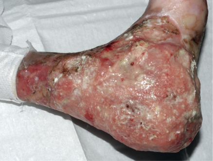 A major complication, usually of RDEB, is the development of multiple cutaneous SCCs . These tumors most often arise in chronic non-healing wounds or hyperkeratotic lesions ( Fig. 32.13 ). Histologically, they are usually well differentiated. However, the borders of the lesions are often indistinct and they are difficult to completely excise, with a tendency to recur locally. In addition, SCCs in EB patients frequently metastasize and are strikingly unresponsive to chemotherapy or radiotherapy. Indeed, they represent the leading cause of death in EB at or after mid-adolescence, with death from an SCC of cutaneous origin occurring in most patients within 5 years of the diagnosis of their first SCC . These tumors occur primarily in RDEB, especially RDEB-gen/sev, although SCCs can also develop in adults with generalized JEB. The cumulative risk of at least one SCC in patients with RDEB-gen/sev is 7.5% by age 20 years but rises to 68%, 80%, and 90% by ages 35, 45, and 55 years, respectively . In contrast, the risk of SCC in other forms of RDEB is <25% by age 45 years .