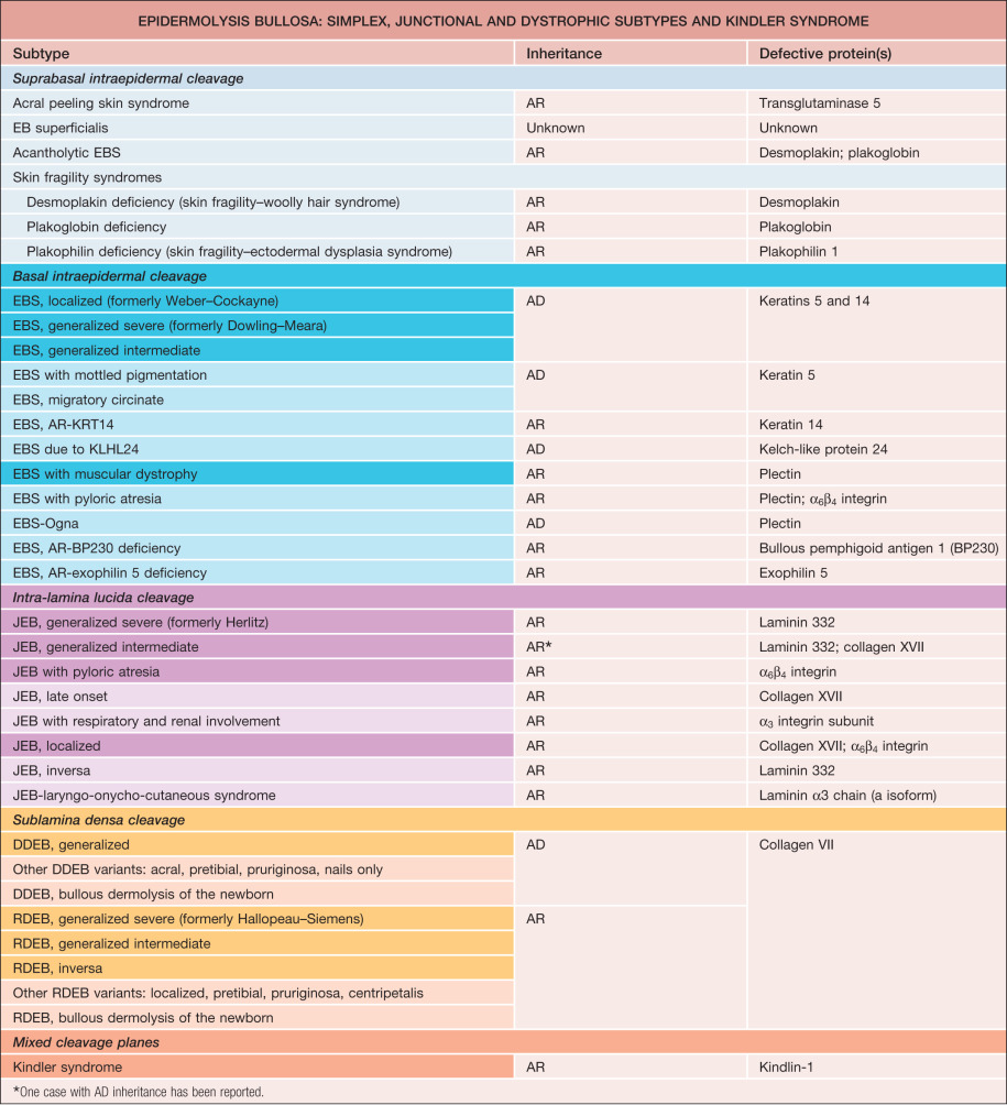 Inherited epidermolysis bullosa (EB), the prototypic mechanobullous disease, is characterized by the development of blisters following seemingly minor or insignificant trauma or traction to the skin . It currently encompasses four major forms – EB simplex, junctional EB, dystrophic EB, and Kindler syndrome – and at least 40 distinctive clinical phenotypes ( Table 32.1 ). Inherited EB can result from mutations within the genes for any of at least 19 structural proteins: keratins 5 and 14; the subunits of laminin 332 (formerly laminin 5); types VII and XVII collagens; plectin; α 6 β 4 integrin; α 3 integrin subunit; bullous pemphigoid antigen 1; kindlin-1 (fermitin family homolog-1); exophilin 5; transglutaminase 5; kelch-like protein 24; and the desmosomal components plakophilin-1, plakoglobin and desmoplakin. Although most of these diseases are rare, research into their underlying pathophysiologic bases has led to major advances in our understanding of the cell and molecular biology of keratins, other keratinocyte-associated structural proteins, collagens, and the cutaneous extracellular matrix (ECM). Study of EB has also helped to elucidate mechanisms of epithelial cell adhesion, migration, and differentiation and to highlight the role of the basement membrane zone in health and disease. The creation of in vitro and animal models of EB has enabled principles of gene therapy to be tested and refined, with development of novel approaches for the treatment of EB patients.