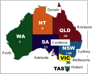 In 2005, the author established a national EB registry based at St George Hospital. There are currently 242 patients enrolled, 140 of whom are in New South Wales (see Fig. 1 ). According to figures by the DebRA charities in New South Wales, Victoria, and SA and the newly formed DebRA Australia, there are likely to be about 400 patients with more severe forms of EB and probably 1000 or more if milder cases are included. DebRA New Zealand has about 40 members (A Kemble-Welch, personal communication, May 2009), and 11 are currently enrolled in the registry. To be enrolled, patients have to be examined by one of the EB clinic dermatologists and have confirmatory biopsies or genetic testing to confirm the subtype of EB. Currently the prevalence of EB is 10 per million population, but in reality it will be higher than this.
