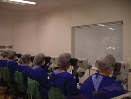 The two most common repetitive tasks are cutting grafts under a microscope and placing the grafts, both of can involve 2 to 4 hours in the same position (Fig. 61.1).