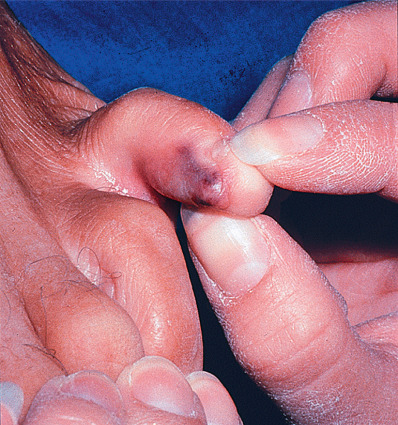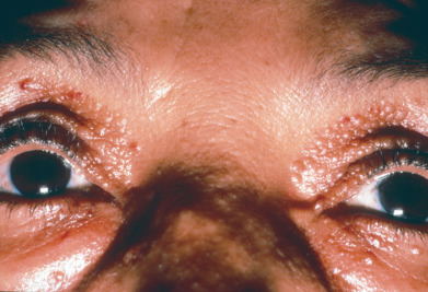 Cutaneous manifestations occur in approximately 40% of patients with primary systemic amyloidosis. The cutaneous eruption usually begins as shiny, smooth, firm, flat-topped, or spherical papules of waxy color that have the appearance of translucent vesicles. These lesions coalesce to form nodules and plaques of various sizes and, in some cases, bandlike lesions. The regions around the eyes, nose, mouth, and mucocutaneous junctions are frequently involved ( Fig. 26.1 ). Vulvar lesions may resemble giant condylomata. Lesions may also be uniform small papules resembling milia or even microcystic lymphatic malformations. Follicular plugging may occur, resulting in milia.