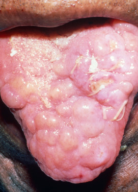 Glossitis, with macroglossia, occurs in at least 20% of patients, may be an early symptom, and can lead to dysphagia. The tongue becomes greatly enlarged, and furrows develop. The lateral aspects show indentations from the teeth. Papules or nodules, sometimes with hemorrhage, occur on the tongue ( Fig. 26.2 ).