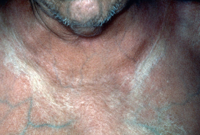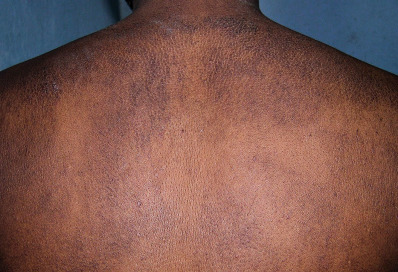 Typically, patients with macular amyloidosis exhibit moderately pruritic, brown, rippled macules characteristically located in the interscapular region of the back ( Fig. 26.3 ). Women outnumber men by 5 : 1 and the disease is chronic. Pigmentation is generally not uniform, giving the lesions a “salt and pepper” or rippled appearance. Many cases of macular amyloid between the scapulae probably result from rubbing dysesthetic areas of notalgia paresthetica. Occasionally, the thighs, shins, arms, breasts, and buttocks may be involved, and these more diffuse cases are usually associated with diffuse pruritus.