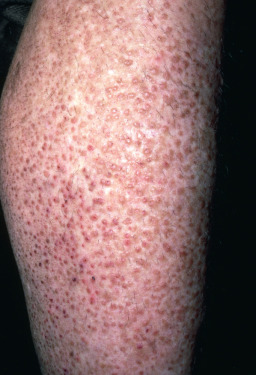 Lichen amyloidosis is characterized by the appearance of paroxysmally itchy lichenoid papules, virtually always appearing bilaterally on the shins ( Fig. 26.4 ). Some patients may deny itching but there is still chronic rubbing. Men outnumber women 2 : 1. Lichen amyloidosis may be found in approximately one third of patients with multiple endocrine neoplasia type IIA (see later discussion). The primary lesions are small, brown, discrete, slightly scaly papules that group to form large, infiltrated plaques. Less frequently, these may occur on the thighs, forearms, face, and even the upper back.