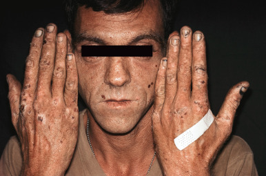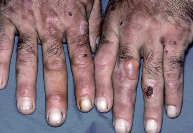With repeated exposure, the skin develops a weather-beaten appearance. Shallow linear or elliptical scars, waxy thickening and pebbling of the skin on the nose and cheeks and over metacarpophalangeal joints, and atrophy of the rims of the ears have been described. Perioral furrow-like scars are characteristic. The dorsal hands and face of EPP patients appear much older than their chronologic age.
