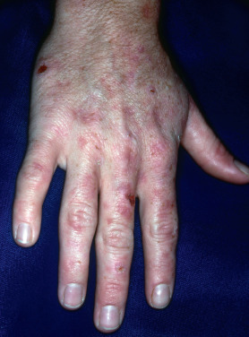 About 2.5% of patients with EPP have a seasonal palmar keratoderma. It is worse in the summer and resolves in winter or with occlusion of the palm by a plaster cast. The keratoderma is waxy and may cover the whole palm or may be localized to the first web space. It is sharply demarcated at the wrist and has no red border. The thickening is moderate in severity. The nails are usually unaffected but may show minimal onycholysis. Patients with nail changes all have true autosomal recessive EPP, with lower levels of erythrocyte protoporphyrin but increased levels of fecal total porphyrin compared with pseudodominant EPP patients. In fact, their erythrocyte protoporphyrin may be near normal. About 45% of patients with autosomal recessive EPP have this keratoderma.