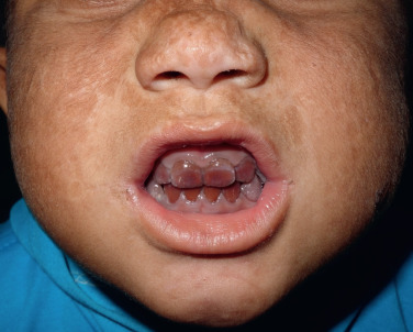 CEP presents soon after birth with the appearance of red urine (noticeable on diapers). Severe photosensitivity occurs and may result in immediate pain and burning, so that the affected child screams when exposed to the sun. The laser used in pulse oximeters may lead to skin lesions of the nail bed. Redness, swelling, and blistering occur and result in scarring of the face ( Fig. 26.11 ), dorsal hands, and scalp (with subsequent alopecia). Ectropion can occur, with subsequent corneal damage and loss of vision. Erythrodontia of both deciduous and permanent teeth is also characteristic (see Fig. 26.11 ). This phenomenon is demonstrated by the coral-red fluorescence of the teeth when exposed to Wood’s light. Mutilating scars, especially on the face, and hypertrichosis of the cheeks, with profuse eyebrows and long eyelashes, occur. Other features seen in CEP include growth retardation, hemolytic anemia, thrombocytopenia, porphyrin gallstones, osteopenia, and increased fracturing of bones.