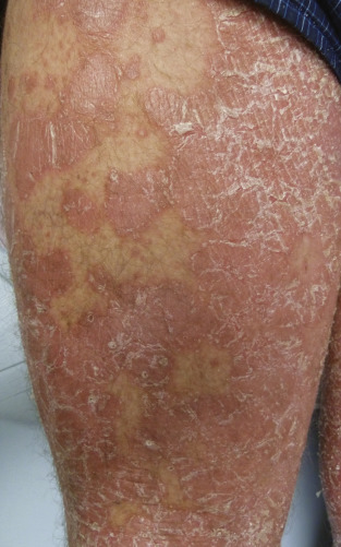 Exacerbation of an underlying skin disease is a common cause of erythroderma. Psoriasis, atopic dermatitis, contact dermatitis, stasis dermatitis, and seborrheic dermatitis can all lead to erythroderma. Psoriatic erythroderma can be triggered by abrupt withdrawal of a systemic medication, including oral corticosteroids, addition of a new medication, topical irritants such as tar or phototherapy burns, pregnancy, or systemic illness. Erythrodermic psoriasis can present with extensive involvement of characteristic psoriatic plaques ( Fig. 14-1 ) or with diffuse erythroderma, often with small pustules or coalescing “lakes” of pus. Erythroderma from atopic dermatitis tends to present as part of a chronic course with extensive lichenification following an uncontrolled flare, but may also present with a more acute erythroderma. New-onset pityriasis rubra pilaris (PRP) is another important consideration in the differential diagnosis of erythroderma. Lesions in PRP tend to have an orange-red hue and are classically separated by islands of sparing ( Fig. 14-2 ). The eruption typically starts on the face or scalp and spreads downwards, with an associated palmoplantar keratoderma. Photosensitivity is a common feature. Follicularly based, hyperkeratotic papules on the fingers, wrists, and elbows may be another clue to the diagnosis.