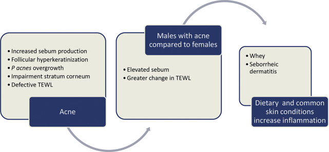 Men are from Mars and women are from Venus , but is this true when treating male patients with acne? Several skin physiologic variances exist between the sexes and may lead physicians to approach their male acne patients differently. Several aspects, including transepidermal water loss (TEWL), pH, and sebum production, have all been demonstrated to be different between the sexes. Adolescent and adult men are also more likely to be affected by seborrheic dermatitis, which shares a similar inflammatory cascade to acne pathogenesis and which may have therapeutic implications for acne. Adolescent and adult men may also consume supplements that increase their insulin growth factor-1 and predispose them to developing more acne. There are also several underlying conditions presenting with acne in adolescent and adult men in several age groups that may require further investigation. As more is learned about skin physiology and the pathogenesis of acne, these few baseline skin physiologic differences may in fact change the approach to male patients with acne in the future.