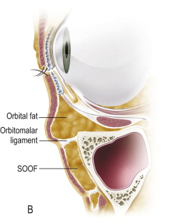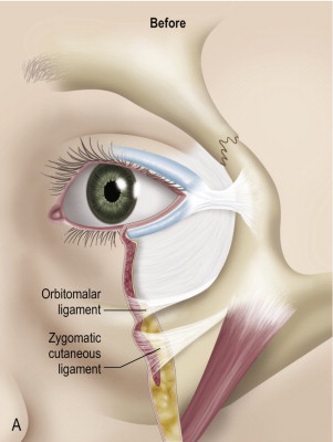 The youthful eyelid lacks lower lid laxity and skin excess. It is characterized by a positive canthal tilt, a lower lid level just superior to the inferior limbus, and a smooth convexity from the lid to the cheek region at the level of the infraorbital rim. As aging occurs, the lid loses some of its tone and the skin, muscle and fat descend over the relatively fixed orbitomalar, zygomatic and nasolabial retaining ligaments. These locations of these ligaments are shown in Figure 9.1 . Additionally, volume loss in the face has a deflationary effect which leads to loss of underlying support and further exacerbation of midface descent.