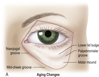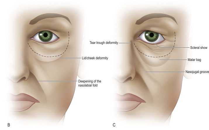 These anatomic changes manifest in the central face in several ways ( Figure 9.2 ). As tarsoligamentous laxity increases, the eye assumes a more rounded shape with a negative canthal tilt as the lateral commissure descends. Malar fat pad ptosis causes loss of cheek prominence and a lengthening of the lid–cheek junction. Nasojugal groove formation occurs creating a ‘tired’ appearance. With attenuated skin now occupying the infraorbital region, the infraorbital rim and the lower lid fat pads become more visible through the skin. The nasolabial fold deepens as cheek soft tissue descends over the nasolabial retaining ligament. There may even be some descent of the lateral oral commissure with increased laxity of the upper lip elevators.