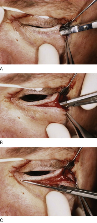 (A) Curved sharp scissors used to spread in the plane between skin and muscle along planned subciliary incision. (B) With skin divided, scissors are spread in the suborbicularis plane along same planned incision line. (C) Scissors now turned and used to divide orbicularis 4 mm below tarsal edge.
