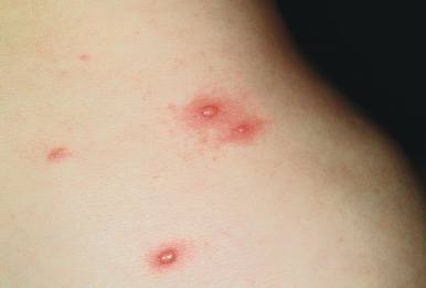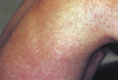 Although several exanthematous eruptions may present with characteristic features such as lesion morphology or distribution, the majority are somewhat nonspecific and may be difficult to distinctly categorize. These eruptions may be hard to distinguish from drug reactions or in some younger patients, miliaria rubra (prickly heat). Unique defining characteristics such as an associated enanthem or symptom complex may be absent. Most nonspecific exanthems fall into the erythematous and/or papular categories, presenting with blanchable red macules and papules with a diffuse distribution ( Fig. 16-20 ). Associated symptoms, which are generally nonspecific as well, may include fever, headache, myalgias, fatigue, and respiratory or gastrointestinal complaints. Most nonspecific exanthems resolve without treatment over 1 week without long-term sequelae.