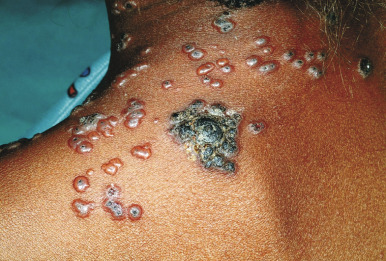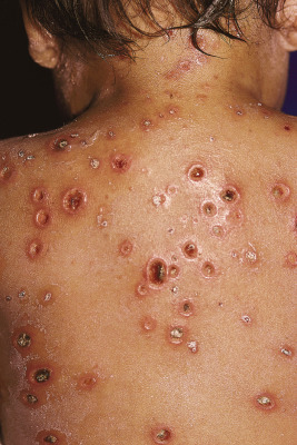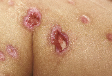 Varicella tends to be a mild, self-limited disease in most immunocompetent hosts. Complications, however, may occur. The most common complication is secondary bacterial superinfection, usually the result of Staphylococcus aureus or GABHS. Invasive GABHS infections, including streptococcal toxic shock syndrome and necrotizing fasciitis, may rarely occur. Secondary bacterial infection usually presents as isolated secondary fever or localized symptoms, such as bulla (large blister) formation or cellulitis. Varicella gangrenosa is diagnosed when an area reveals rapidly progressing erythema, induration, and pain. Peripheral gangrene may occur in the distal extremities. Other skin-related complications include deep ulcerative lesions ( Fig. 16-6 ), subcutaneous abscesses, and regional lymphadenitis. Patients under the age of 5 years who live in a household with older children seem to be at greatest risk for bacterial complications. In patients who develop secondary bacterial infection, bacteremia may occur, as may pneumonia, arthritis, or osteomyelitis.