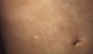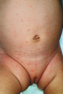 A broad range of conditions has been potentially linked to infection with HHV-6 and HHV-7 ( Table 16-2 ). By far, however, the best-recognized association for both agents is that of roseola infantum. Roseola is a mild exanthematous illness that most often occurs in children under 3 years of age. The classic presentation is that of high fever (38 to 41° C [101 to 106° F]) that lasts for 3 to 5 days in an otherwise-well infant. With normalization of the temperature, the classic exanthem appears, initially on the trunk and eventually spreading to involve the extremities, neck, and face. The skin eruption is composed of fairly nondescript, erythematous, blanchable macules and papules ( Fig. 16-19 ) that occasionally display a peripheral halo of vasoconstriction. The exanthem usually resolves over 1 to 3 days.