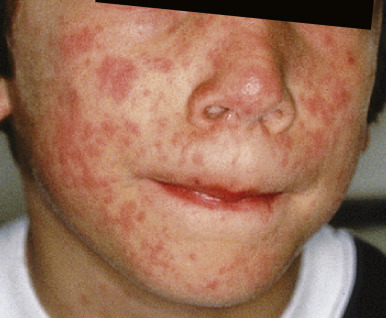 Several viral and bacterial illnesses may be accompanied by localized or generalized skin eruptions called exanthems . These eruptions may be the first manifestation of a disorder and often are the reason for parents and patients to pursue medical evaluation. Prompt recognition and diagnosis of exanthems is desirable and may dictate that other examinations be performed to assess for systemic associations. Although identification of the exact infectious agent is not always practical or possible, knowledge of the most common causes of the various exanthems is important from an epidemiologic perspective. For instance, when diagnosing a child with a parvovirus B19-related exanthematous disease, consideration of at-risk contacts (i.e., gravid females, individuals with hemolysis or conditions resulting in decreased red blood cell production) is vital.