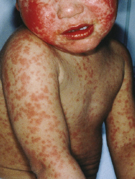 The diagnosis of measles is traditionally made based upon clinical presentation with laboratory confirmation. Acute and convalescent serologic studies documenting a fourfold increase in titer confirm the diagnosis of measles. PCR and semiquantitative real-time PCR assays have been developed, the latter being quite sensitive and specific and potentially useful in situations where early and rapid diagnosis is vital. The treatment of uncomplicated measles is largely supportive, because specific antiviral therapies do not exist. Ribavirin, a synthetic nucleoside analog useful in the treatment of other paramyxovirus (i.e., respiratory syncytial virus) infections, has been utilized in severely ill or immunocompromised patients. Antibiotics are useful in patients with secondary bacterial infections such as otitis media or bacterial pneumonia. Vitamin A supplementation has been recommended by the World Health Organization and the United Nations International Children’s Emergency Fund for children with measles who reside in areas where vitamin A deficiency is a recognized problem or where the measles case fatality rate is 1% or greater. In these instances, vitamin A appears to reduce mortality and ameliorate the severity of diarrhea, possibly through a protective action on the epithelial lining of the gastrointestinal tract, increased mucus secretion, and enhanced local barriers to infection. Hospitalized patients with measles should be kept in respiratory isolation for 4 days from the onset of the rash. Most patients will recover completely without sequelae and have lifelong immune protection against reinfection.