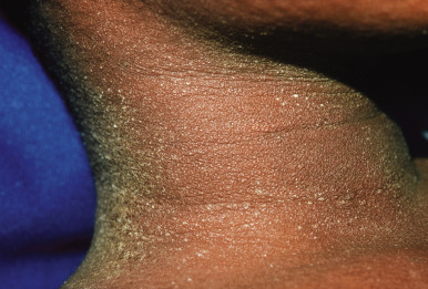 Tender anterior cervical adenopathy is commonly present in patients with scarlet fever, and rhinorrhea and cough are usually absent. Some experts argue that presence of the latter two findings is a negative factor for the diagnosis of GABHS infection. The exanthem of scarlet fever presents as a fine, erythematous, macular and papular eruption ( Fig. 16-10 ) that has been described as “sandpapery.” It involves the trunk and extremities and may be accentuated in flexural areas with a petechial component (Pastia lines). In darker-skinned individuals, the exanthem of scarlet fever may be more difficult to recognize and may consist only of punctate papules resembling cutis anserina (“goose flesh”) ( Fig. 16-11 ). Circumoral pallor may be a useful clinical sign and is visualized as a rim of pallor encircling the perioral area. The exanthem generally resolves over 4 to 5 days and may heal with thick sheets of desquamation, especially over the hands, feet, toes, and fingers ( Fig. 16-12 ). An interesting observation is that the SPEs produced by GABHS contribute to the exanthem by their ability to stimulate a delayed-type hypersensitivity response that requires prior exposure of the host to the organism.