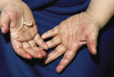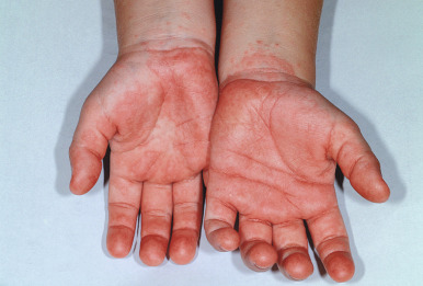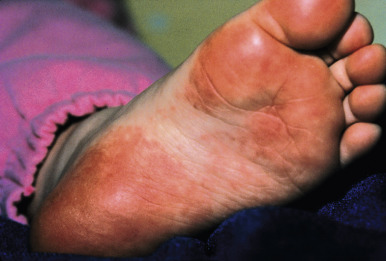 Papular-purpuric gloves-and-socks syndrome (PPGSS) is another viral exanthematous illness that in many (but not all) cases has been documented to be caused by B19. This rare disorder presents most often in young adults and less often in children and is usually diagnosed during the spring and summer months. Patients with PPGSS present with the acute onset of rapidly progressive, symmetric swelling and erythema of the hands and feet, often with a petechial or purpuric component ( Figs. 16-17 and 16-18 ). Bullous lesions are rarely present. The eruption has a sharp demarcation at the wrists and ankles and is usually quite pruritic. A more diffuse, papular exanthem may occur elsewhere on the body. An associated enanthem consisting of hyperemia, petechiae, and erosions is often present and affects the soft and hard palate, pharynx, tongue, and inner lips. The symptoms of PPGSS tend to be milder in children and adolescents when compared with adults.