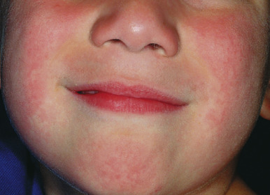 EI is the most recognizable B19-associated manifestation. It is also known as “slapped cheek” disease given the characteristic fiery-red facial erythema ( Fig. 16-14 ) that occurs 2 to 3 days after the prodromal symptoms. The cheeks are most prominently affected, with the nasal bridge and perioral areas usually being spared. This phase of the illness has been termed the first stage, and is subsequently followed by stages two and three. The differential diagnosis of the initial eruption of EI includes phototoxic reaction and systemic lupus erythematosus.