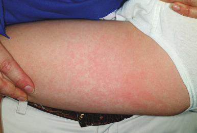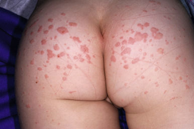 During stage two, the patient develops a lacy, reticulated eruption on the extremities and trunk 1 to 4 days after the facial rash. This eruption may be pruritic and is often evanescent. It often begins with a confluent pattern followed by central clearing, which results in the lacy and reticulated appearance ( Figs. 16-15 and 16-16 ). The palms and soles are usually spared. The rash of the second stage of EI tends to fade over 2 to 3 weeks but may intermittently recur in response to environmental stimuli including sunlight, warm temperatures (i.e., a hot bath), or physical activity. This intermittent waxing and waning represents the third stage of EI, and the duration is variable, usually 1 to 3 weeks.